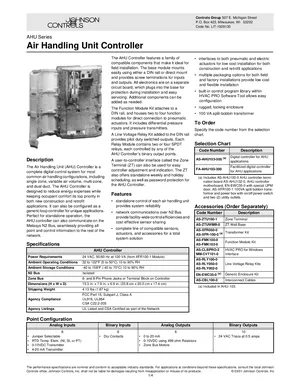 Datasheet for the Johnson Controls Air Handling Unit Controller, published in 2001. Document No: LIT-1928130. 32 models including AS-AHU103-300, FA-AHU103-300, AS-ZTU100-1 and 29 additional variants. Product features, environmental operating limits, and compatibility data.