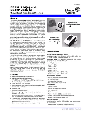 Datasheet for the Johnson Controls BEAM1224 and BEAM1224S, published in 2009. Document No: JCI-60170, Rev: B. 15 models including BEAM1224, BEAM1224A, BEAM1224S and 12 additional variants. Engineering specifications, wiring diagrams, and mounting dimensions.