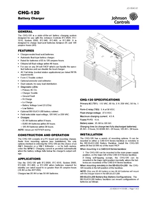 Datasheet for the Johnson Controls CHG-120, published in 2008. Document No: JCI-6040, Rev: A1. 17 models including CHG-120, IFC-2020, IFC-1010 and 14 additional variants. Product features, environmental operating limits, and compatibility data.