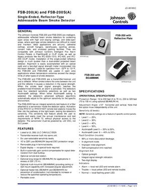 Datasheet for the Johnson Controls FSB-200 and FSB-200S, published in 2009. Document No: JCI-60189, Rev: C. 19 models including FSB-200, FSB-200S, FSB-200A and 16 additional variants. Product features, environmental operating limits, and compatibility data.