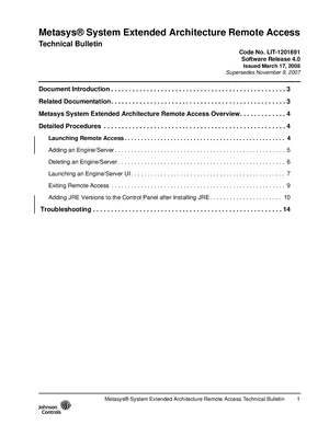 Technical Reference Manual for the Johnson Controls Metasys Remote Access, published in 2008. Document No: LIT-1201691, Rev: Software Release 4.0. Model Metasys Remote Access. Advanced technical data, communication protocols, and design criteria.