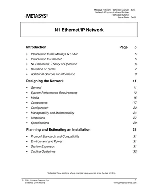 Technical Reference Manual for the Johnson Controls N1 Ethernet/IP Network, published in 2001. Document No: LIT-6360175, Rev: 11.00. Model NCM 350. System architecture, detailed circuit analysis, and engineering specifications.