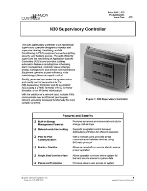 Datasheet for the Johnson Controls N30, published in 2001. Document No: LIT-6891050, Rev: 0301. 6 models including N30, MS-N30 1010-1, MS-N30 1310-1 and 3 additional variants. Product features, environmental operating limits, and compatibility data.
