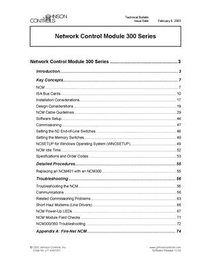 Installation, Programming, and Technical Reference Manual for the Johnson Controls Network Control Module 300 Series, published in 2003. Document No: LIT-6360251. 20 models including NCM300, NCM311, NCM350 and 17 additional variants. Hardware installation, alarm/fault management, and advanced system configuration.