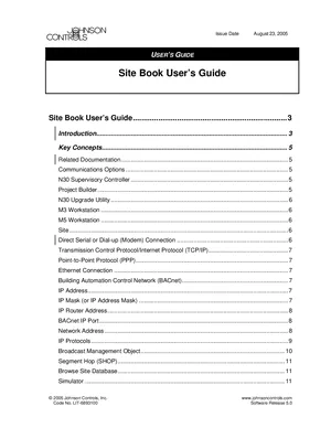 User Guide for the Johnson Controls Site Book, published in 2005. Document No: LIT-6893100, Rev: 5.0. Model Site Book. User interface overview, common tasks, and troubleshooting tips.