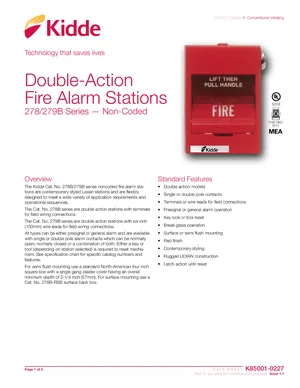 Datasheet for the Kidde 278/279B Series Fire Alarm Stations, published in 2020. Document No: K85001-0227, Rev: Issue 1.1. 16 models including 278B, 279B, 277B and 13 additional variants. Detailed technical specifications, electrical ratings, and agency listings.