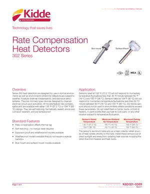 Datasheet for the Kidde 302 Series Heat Detectors, published in 2016. Document No: K85001-0589, Rev: Issue 1. 14 models including 302, 302-AW, 302-ET and 11 additional variants. Engineering specifications, wiring diagrams, and mounting dimensions.