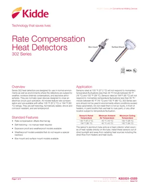 Datasheet for the Kidde 302 Series Heat Detectors, published in 2021. Document No: K85001-0589, Rev: Issue 1.2. 14 models including 302, 302-AW, 302-ET and 11 additional variants. Detailed technical specifications, electrical ratings, and agency listings.