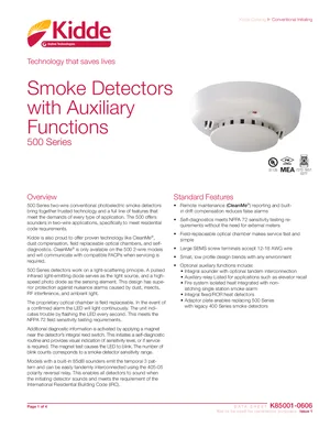 Datasheet for the Kidde 500 Series Smoke Detectors, published in 2016. Document No: K85001-0606, Rev: Issue 1. 10 models including 521B, 521BXT, 521NCRXT and 7 additional variants. Engineering specifications, wiring diagrams, and mounting dimensions.