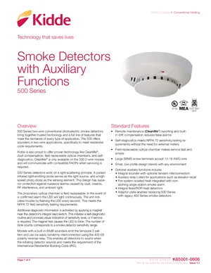Datasheet for the Kidde 500 Series Smoke Detectors, published in 2020. Document No: K85001-0606, Rev: 1.1. 10 models including 521B, 521BXT, 521NCRXT and 7 additional variants. Engineering specifications, wiring diagrams, and mounting dimensions.