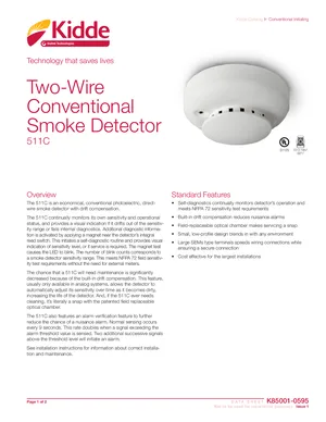 Datasheet for the Kidde 511C, published in 2016. Document No: K85001-0595, Rev: Issue 1. 4 models including 511C, SM200-12PKG, SM-EXT 1 and 1 additional variants. Engineering specifications, wiring diagrams, and mounting dimensions.