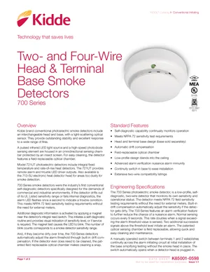 Datasheet for the Kidde 700 Series Smoke Detectors, published in 2020. Document No: K85001-0598, Rev: Issue 1.1. 9 models including 711U, 721UT, 731U and 6 additional variants. Product features, environmental operating limits, and compatibility data.