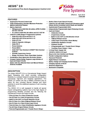 Datasheet for the Kidde AEGIS 2.0, published in 2016. Document No: K-84-200, Rev: AA. 5 models including AEGIS 2.0, 700 Series, CPD-705x and 2 additional variants. Product features, environmental operating limits, and compatibility data.