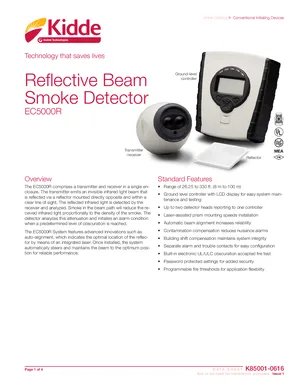 Datasheet for the Kidde EC5000R, published in 2016. Document No: K85001-0616, Rev: Issue 1. 13 models including EC5000R, EC5000X, 5000-004 and 10 additional variants. Product features, environmental operating limits, and compatibility data.