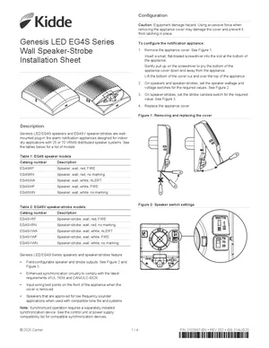 Installation Manual for the Kidde Genesis LED EG4S Series, published in 2020. Document No: 3102667-EN, Rev: 002. 10 models including EG4SRF, EG4SRN, EG4SWA and 7 additional variants. Physical installation guide, backbox dimensions, and cabling specifications.