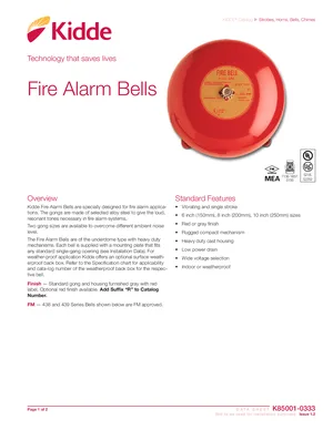 Datasheet for the Kidde Fire Alarm Bells, published in 2021. Document No: K85001-0333, Rev: 1.2. 9 models including 323D-10AW-R, 438D-6N5-R, 438D-10N5-R and 6 additional variants. Engineering specifications, wiring diagrams, and mounting dimensions.