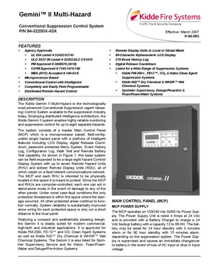 Datasheet for the Kidde Gemini II Multi-Hazard, published in 2007. Document No: K-84-003, Rev: AB. 14 models including Gemini II, MCP, RHU and 11 additional variants. Product features, environmental operating limits, and compatibility data.