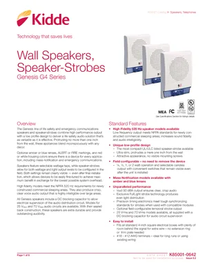 Datasheet for the Kidde Genesis G4 Series Speakers, published in 2021. Document No: K85001-0642, Rev: 2.2. 54 models including EG4-S2, G4HFWN-S2, EG4R-S2 and 51 additional variants. Detailed technical specifications, electrical ratings, and agency listings.