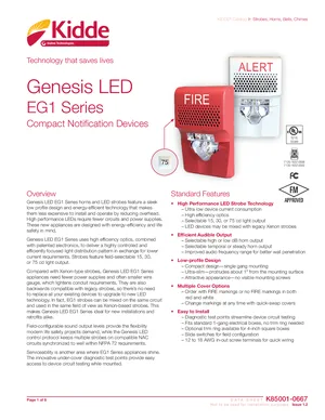 Datasheet for the Kidde Genesis LED EG1 Series Compact Notification Devices, published in 2019. Document No: K85001-0667, Rev: Issue 1.2. 25 models including EG1ARF, EG1ARN, EG1AWF and 22 additional variants. Engineering specifications, wiring diagrams, and mounting dimensions.