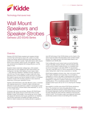 Datasheet for the Kidde Genesis LED EG4S Series, published in 2021. Document No: K85001-1026, Rev: Issue 1.3. 26 models including EG4S, EG4SRF, EG4SRN and 23 additional variants. Engineering specifications, wiring diagrams, and mounting dimensions.
