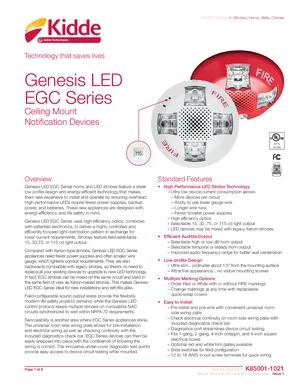 Datasheet for the Kidde Genesis LED EGC, published in 2019. Document No: K85001-1021, Rev: Issue 1. 27 models including EGCARF, EGCAWF, EGCVRF and 24 additional variants. Detailed technical specifications, electrical ratings, and agency listings.
