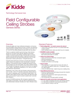 Datasheet for the Kidde Genesis Series Ceiling Strobes, published in 2020. Document No: K85001-0557, Rev: 2.1. 15 models including GC-VM, GCF-VM, GCFR-VM and 12 additional variants. Engineering specifications, wiring diagrams, and mounting dimensions.