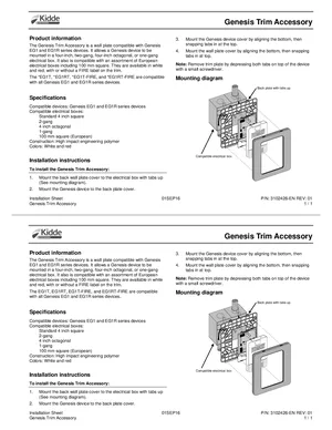 Installation Manual for the Kidde Genesis Trim Accessory, published in 2016. Document No: 3102426-EN, Rev: 01. Model Genesis Trim Accessory. Mounting instructions, wiring diagrams, and system power-up procedures.