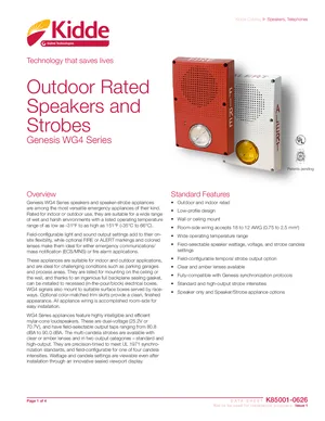 Datasheet for the Kidde Genesis WG4 Series, published in 2016. Document No: K85001-0626, Rev: 1. 19 models including WG4RF-SVMC, WG4WF-SVMC, WG4RN-SVMC and 16 additional variants. Detailed technical specifications, electrical ratings, and agency listings.