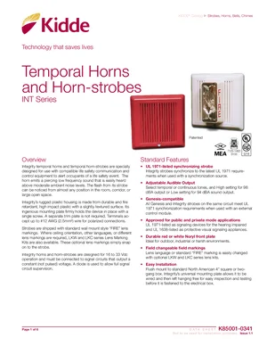 Datasheet for the Kidde INT Series Temporal Horns, published in 2020. Document No: K85001-0341, Rev: 1.1. 5 models including INT-T, INT-5AT, INT-7AT and 2 additional variants. Detailed technical specifications, electrical ratings, and agency listings.