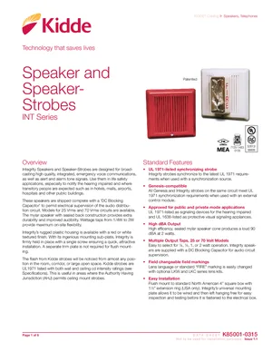 Datasheet for the Kidde INT Series Speaker and Speaker-Strobes, published in 2020. Document No: K85001-0315, Rev: 1.1. 23 models including INT-S2, INT-S2W, INT-5AS2 and 20 additional variants. Engineering specifications, wiring diagrams, and mounting dimensions.