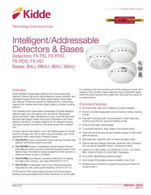 Datasheet for the Kidde Intelligent/Addressable Detectors, published in 2020. Document No: K85001-0652, Rev: 1.1. 8 models including FX-PD, FX-PHD, FX-PDD and 5 additional variants. Detailed technical specifications, electrical ratings, and agency listings.
