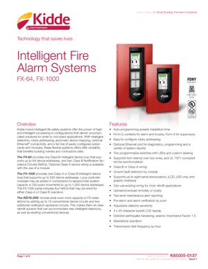 Datasheet for the Kidde Intelligent Fire Alarm Systems, published in 2016. Document No: K85005-0137, Rev: Issue 1. 23 models including FX-64, FX-1000, FX-64RD and 20 additional variants. Product features, environmental operating limits, and compatibility data.
