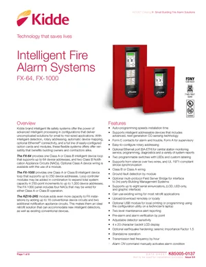 Datasheet for the Kidde Intelligent Fire Alarm Systems, published in 2021. Document No: K85005-0137, Rev: Issue 3.0. 61 models including FX-64, FX-1000, RZI16-2RS and 58 additional variants. Engineering specifications, wiring diagrams, and mounting dimensions.