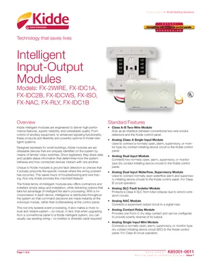 Datasheet for the Kidde Intelligent Input-Output Modules, published in 2016. Document No: K85001-0611, Rev: 1. 8 models including FX-2WIRE, FX-IDC1A, FX-IDC2B and 5 additional variants. Engineering specifications, wiring diagrams, and mounting dimensions.