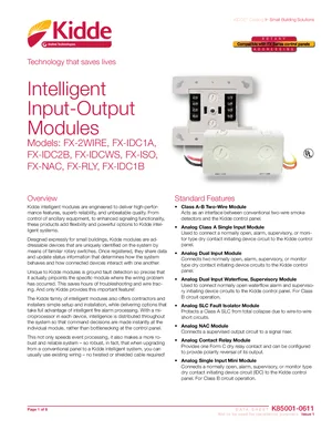 Datasheet for the Kidde Intelligent Input-Output Modules, published in 2018. Document No: K85001-0611, Rev: Issue 1. 8 models including FX-2WIRE, FX-IDC1A, FX-IDC2B and 5 additional variants. Engineering specifications, wiring diagrams, and mounting dimensions.