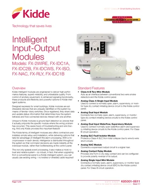 Datasheet for the Kidde Intelligent Input-Output Modules, published in 2020. Document No: K85001-0611, Rev: 1.1. 8 models including FX-2WIRE, FX-IDC1A, FX-IDC2B and 5 additional variants. Detailed technical specifications, electrical ratings, and agency listings.