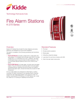 Datasheet for the Kidde K-270 Series Fire Alarm Stations, published in 2021. Document No: K85001-0303, Rev: Issue 1.1. 9 models including K-270, K-270A, K-270P and 6 additional variants. Detailed technical specifications, electrical ratings, and agency listings.
