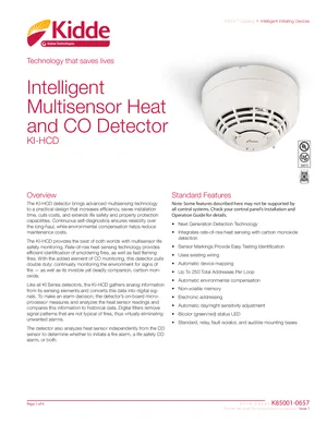 Datasheet for the Kidde KI-HCD, published in 2019. Document No: K85001-0657, Rev: Issue 1. 19 models including KI-HCD, KI-COD, KI-SB and 16 additional variants. Product features, environmental operating limits, and compatibility data.