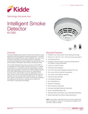Datasheet for the Kidde KI-OSD, published in 2020. Document No: K85001-1001, Rev: Issue 1. 18 models including KI-OSD, KI-SB, KI-SB4 and 15 additional variants. Product features, environmental operating limits, and compatibility data.