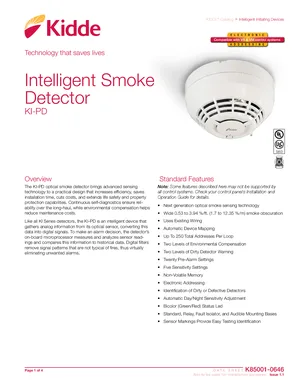 Datasheet for the Kidde KI-PD, published in 2020. Document No: K85001-0646, Rev: Issue 1.1. 18 models including KI-PD, KI-SB, KI-SB4 and 15 additional variants. Detailed technical specifications, electrical ratings, and agency listings.