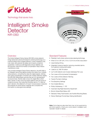 Datasheet for the Kidde KIR-OSD, published in 2022. Document No: K85001-1020, Rev: Issue 1. 15 models including KIR-OSD, KI-SB, KI-SB4 and 12 additional variants. Product features, environmental operating limits, and compatibility data.