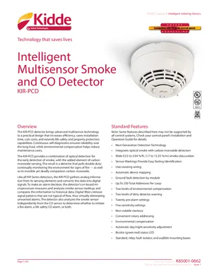 Datasheet for the Kidde KIR-PCD, published in 2019. Document No: K85001-0662, Rev: Issue 1. 17 models including KIR-PCD, KI-SB, KI-SB4 and 14 additional variants. Engineering specifications, wiring diagrams, and mounting dimensions.