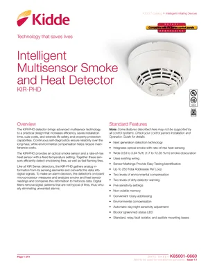 Datasheet for the Kidde KIR-PHD, published in 2020. Document No: K85001-0660, Rev: 1.1. 14 models including KIR-PHD, KI-SB, KI-SB4 and 11 additional variants. Product features, environmental operating limits, and compatibility data.