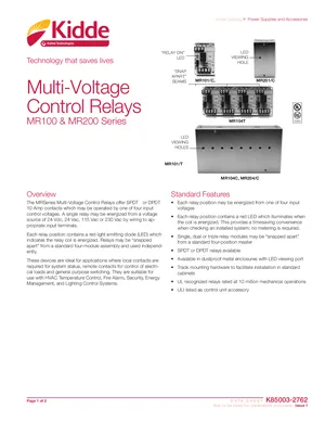 Datasheet for the Kidde MR100 & MR200 Series Control Relays, published in 2016. Document No: K85003-2762, Rev: Issue 1. 12 models including MR100, MR200, MR101/T and 9 additional variants. Engineering specifications, wiring diagrams, and mounting dimensions.