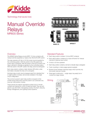 Datasheet for the Kidde MR600 Series Manual Override Relays, published in 2016. Document No: K85003-2761, Rev: Issue 1. 6 models including MR600 Series, MR601/S, MR604/T and 3 additional variants. Detailed technical specifications, electrical ratings, and agency listings.