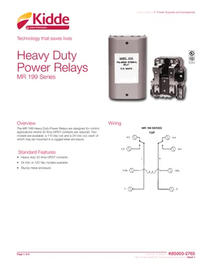 Datasheet for the Kidde 199 Series Power Relays, published in 2016. Document No: K85003-2765, Rev: 1. 4 models including MR 199X13, MR 199X13/C, MR 199AX14 and 1 additional variants. Product features, environmental operating limits, and compatibility data.