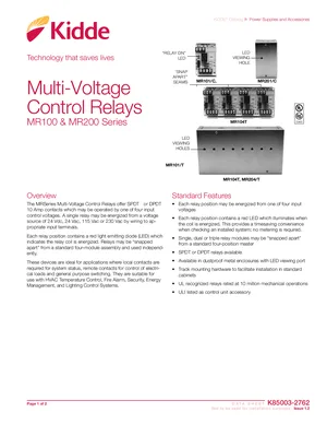 Datasheet for the Kidde Multi-Voltage Control Relays, published in 2021. Document No: K85003-2762, Rev: Issue 1.2. 10 models including MR100, MR200, MR101/T and 7 additional variants. Detailed technical specifications, electrical ratings, and agency listings.
