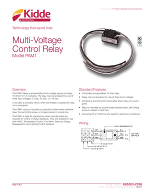 Datasheet for the Kidde PAM1, published in 2016. Document No: K85003-2766, Rev: Issue 1. Model PAM1. Engineering specifications, wiring diagrams, and mounting dimensions.