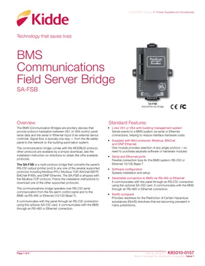 Datasheet for the Kidde SA-FSB, published in 2021. Document No: K85010-0157, Rev: Issue 1. 6 models including SA-FSB, VS1, VS4 and 3 additional variants. Product features, environmental operating limits, and compatibility data.