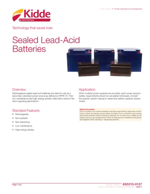 Datasheet for the Kidde Sealed Lead-Acid Batteries, published in 2016. Document No: K85010-0127, Rev: 1. 11 models including 12V1A2, 12V4A, 12V6A5 and 8 additional variants. Engineering specifications, wiring diagrams, and mounting dimensions.